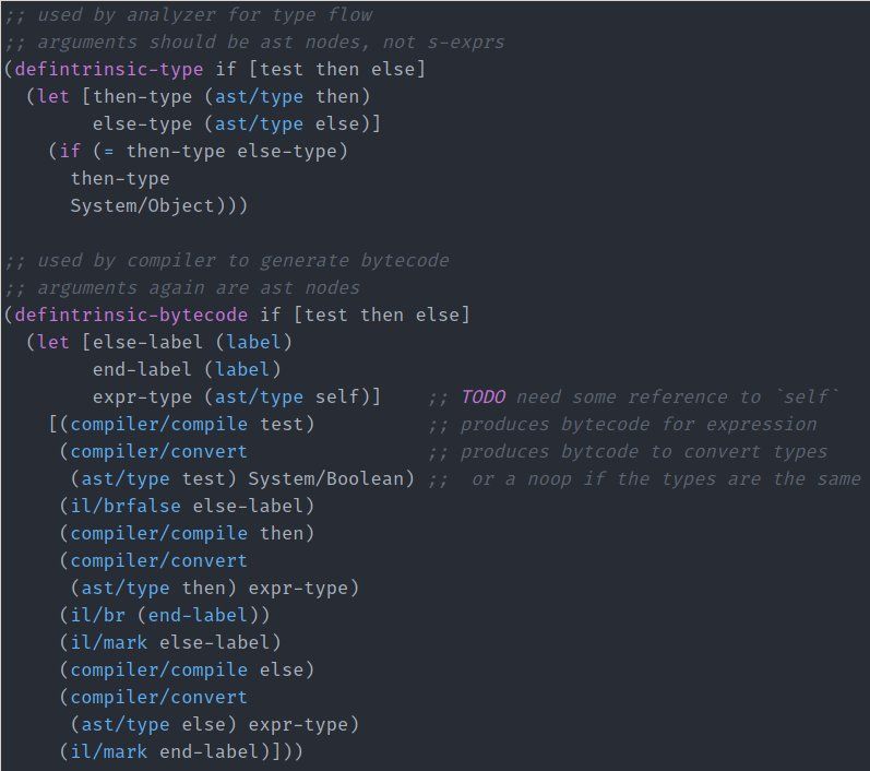 maybe overthinking, but i cant shake the feeling that w bytecode macros you can write a lisp with very few 'special forms' here's a fairly complete sketch of an implementation of if. i think the only special forms would be anything that does name binding (e.g. let, fn, def) #jn