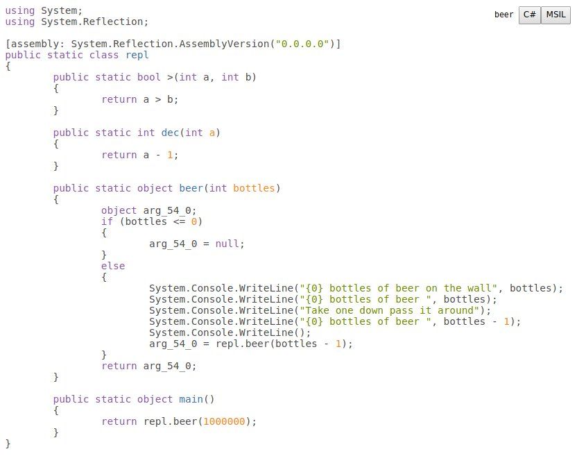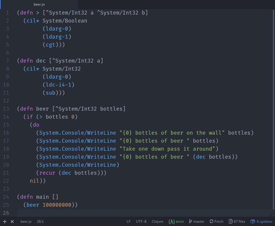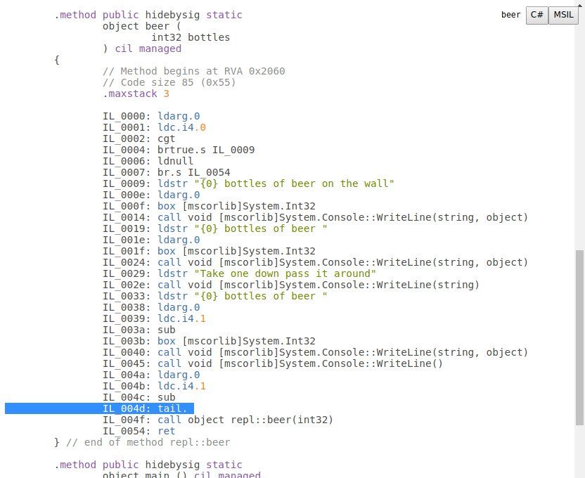 1. baby's first tail call optimization! i added a recur special form to jn and patched the compiler to emit a CLR tail instruction when possible and it totally works! i implemented the recursive 99 bottles of beer algorithm to test. source, c# disassembly, msil disassembly.