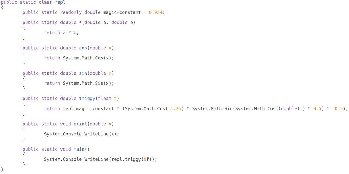 some self-care compiler hacking. i added more comprehensive number syntax to jn, probably the most syntaxy part of the language. there's floating point short hand and some modifiers. here's some trig, source and c# disassembly (w/dynamic stub methods omitted for brevity)