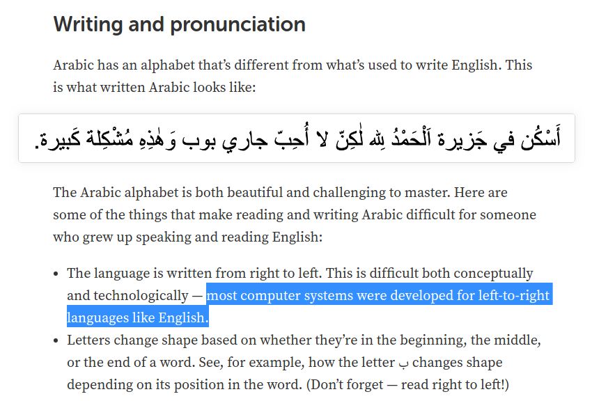 they do a good job of reminding the reader that every language -- including English -- is fucking weird, and Arabic's weird parts are not categorically weirder, just different from what you might be used to. Arabic isn't "hard" while English is "easy" and i appreciate that a lot.