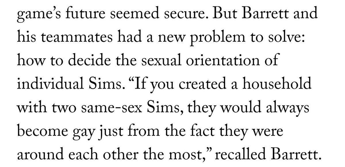 the whole New Yorker article about the gay kiss in The Sims is great but this is absolutely the best part #gaybydefault