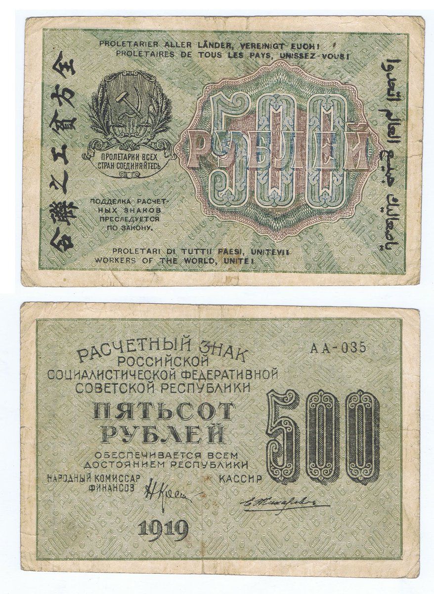 fascinated by this 1919 soviet banknote that displays "workers of the world unite" in 7 languages including correct Arabic! they translate it as