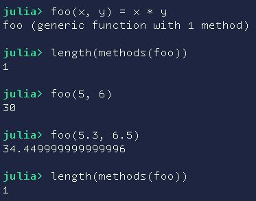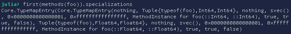 julia friends: is there a way to see the generic function specializations the compiler generates based on call sites seen at runtime? in this case id want to see foo(Int64,Int64) and foo(Float64,Float64) in addition to the foo(Any,Any) i provided.